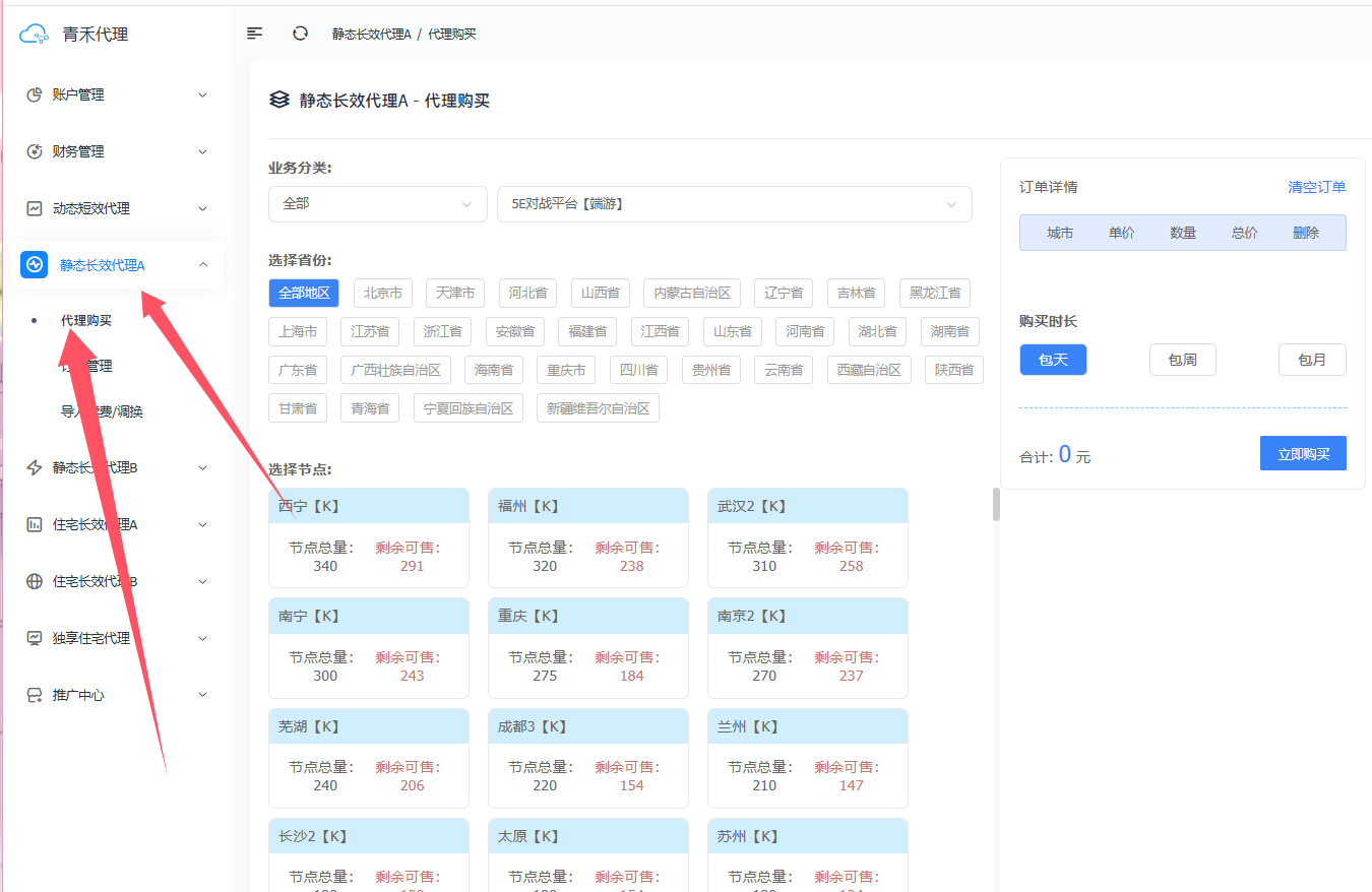 第二步:点击"静态长效代理A",点击"代理购买"