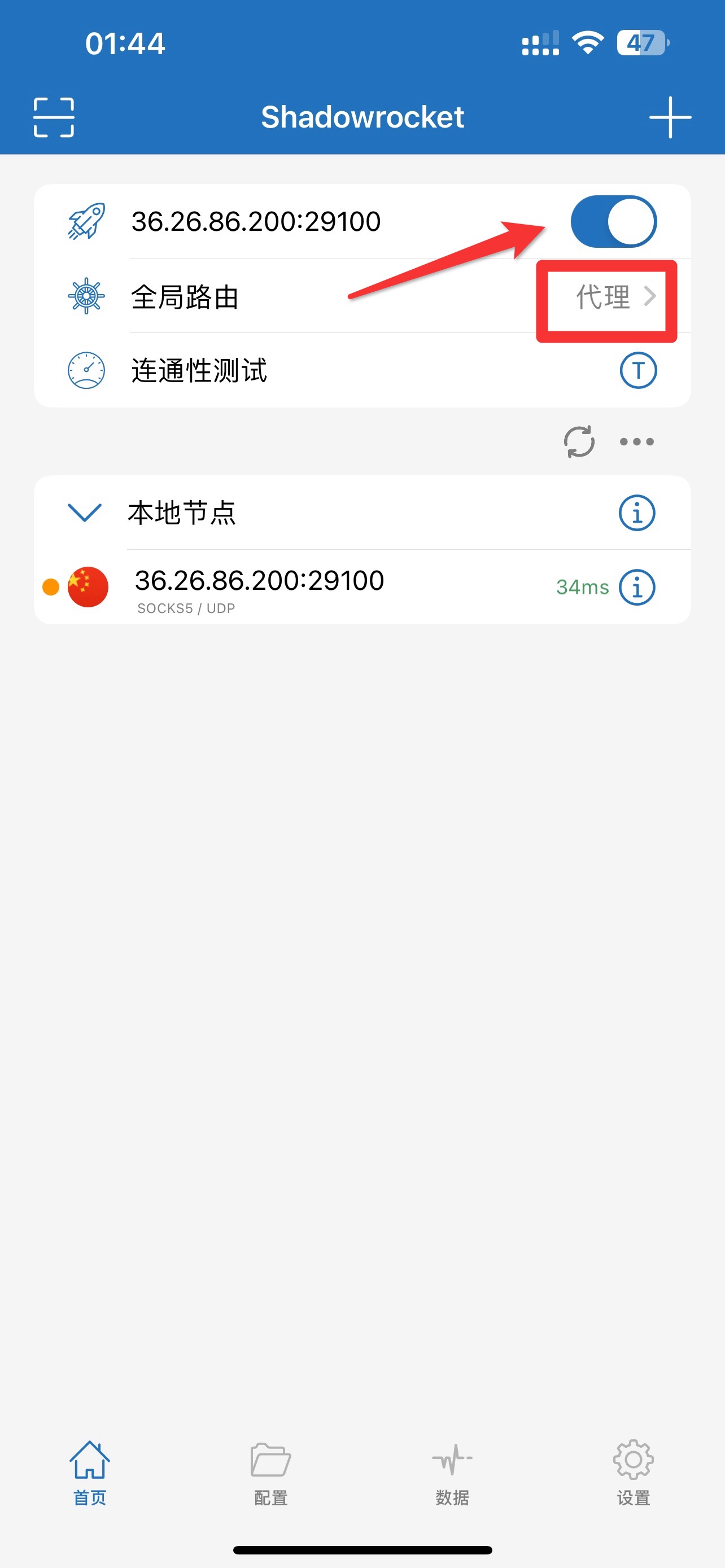 3. 全局路由选项选择代理,服务器节点选择刚设置的IP,然后打开连接开关